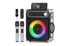 Portable karaoke machine with powerful sound, colorful lights, and versatile connectivity.